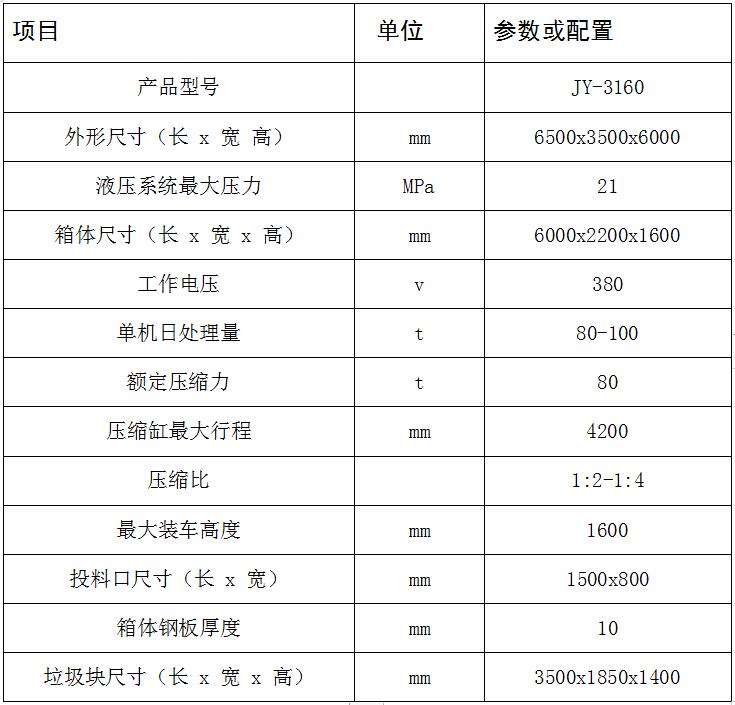 JY-3160 水平式四柱舉升垃圾壓縮設備用于對城鎮(zhèn)居民生活區(qū)、學校、醫(yī)院、公園景區(qū)、廠礦和機關(guān)單位的生活垃圾以及固體廢棄物的收集、壓縮減容和封閉轉(zhuǎn)運。