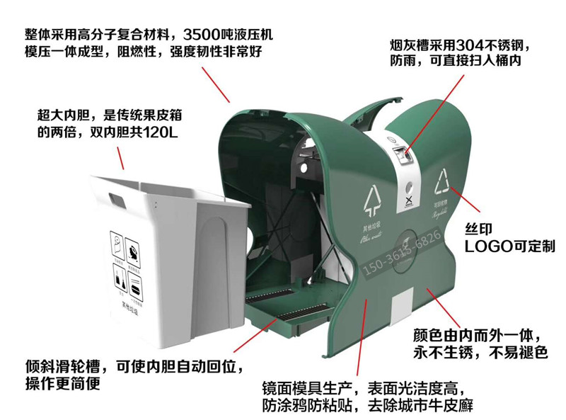 產品特點: 鏡面模具生產,表面光潔度高,防涂鴉防粘貼,防砸,耐燒,永不生銹,不易褪色,耐酸堿,易清洗,使用壽命長,具有天然的防盜功能;操作簡單,深受環(huán)衛(wèi)系統(tǒng)客戶青睞。